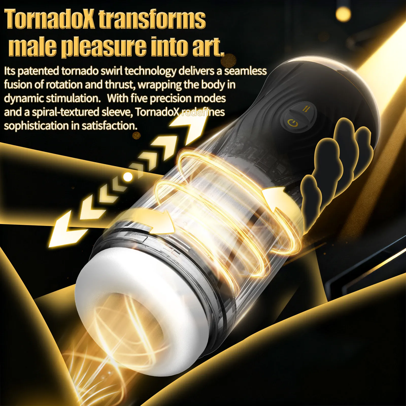 Experience the art of precision pleasure. TornadoX Swirl Masturbator fuses advanced 360° swirl motion with powerful up-and-down thrust, wrapping the body in a seamless tornado of stimulation. Crafted from premium TPE and engineered for pure indulgence — this is desire refined.